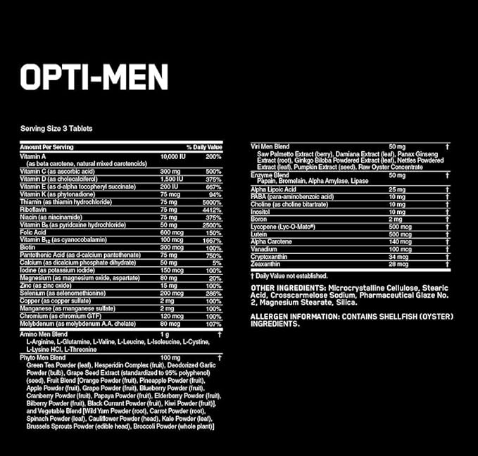 Opti-Men از Optimum Nutrition یک سیستم کامل بهینه سازی مواد مغذی است که بیش از 75 ماده فعال در 4 ترکیب را ارائه می دهد که به طور خاص برای حمایت از نیازهای مواد مغذی مردان فعال طراحی شده است. مولتی ویتامین مردانه اپتیموم 150تایی که به صورت یک قرص در صبحانه، ناهار و شام مصرف میشود، 22 ویتامین و مواد معدنی ضروری را فراهم میکند – از جمله 1500 واحد ویتامین D، اسیدهای آمینه آزاد، عصارههای گیاهی و آنتیاکسیدانها در مقادیر اساسی که میتوان از طریق مصرف آن را به دست آورد.