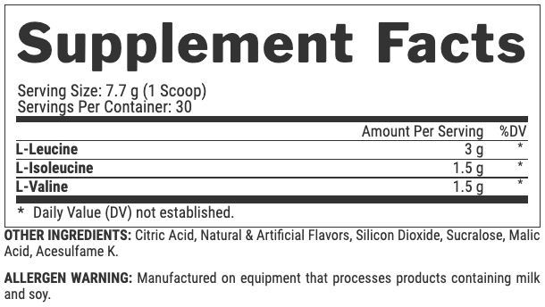 - هر وعده (6 قرص) حاوی 6000 میلیگرم اسیدهای آمینه شاخهدار (3000 میلیگرم لوسین، 1500 میلیگرم ایزولوسین و 1500 میلیگرم والین) است.